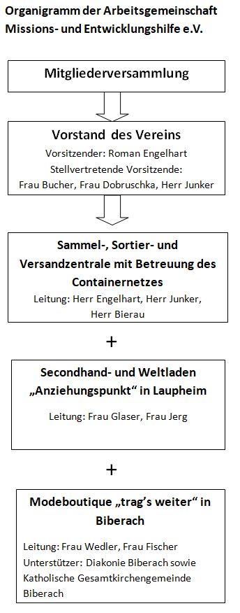 Der Betreiber der Sammelzentrale Aktion Hoffnung Laupheim ist die Arbeitsgemeinschaft Missions- und Entwicklungshilfe e.V.. Satzungszweck des Vereins sind u.a. die Abgabe von Hilfsgütern an bedürftige Menschen im In- und Ausland, der Betrieb von Ladengeschäften, die Förderung von Projekten der Entwicklungszusammenarbeit sowie die Bildungsarbeit. Die Mitgliederversammlung wählt den Vorstand des Vereins.